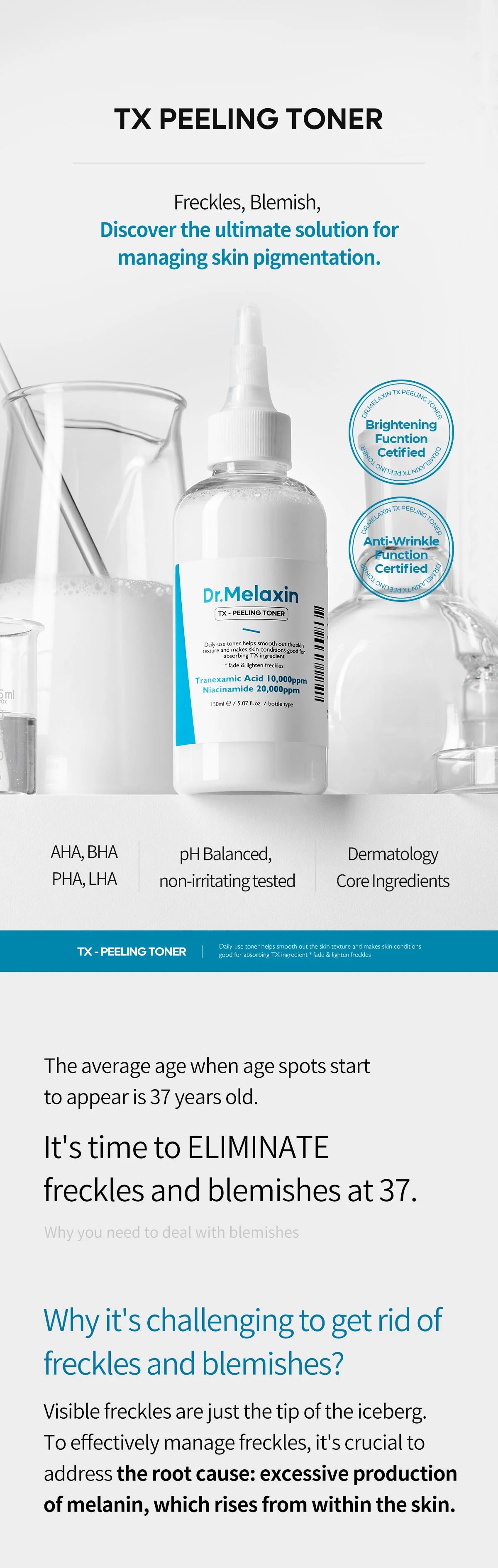 Dr. Melaxin's TX Peeling Toner is a daily-use skincare product designed to enhance skin texture and promote a brighter, more even complexion. Its dual-layer formulation combines exfoliating agents with moisturizing components to gently remove dead skin cells and improve skin tone.