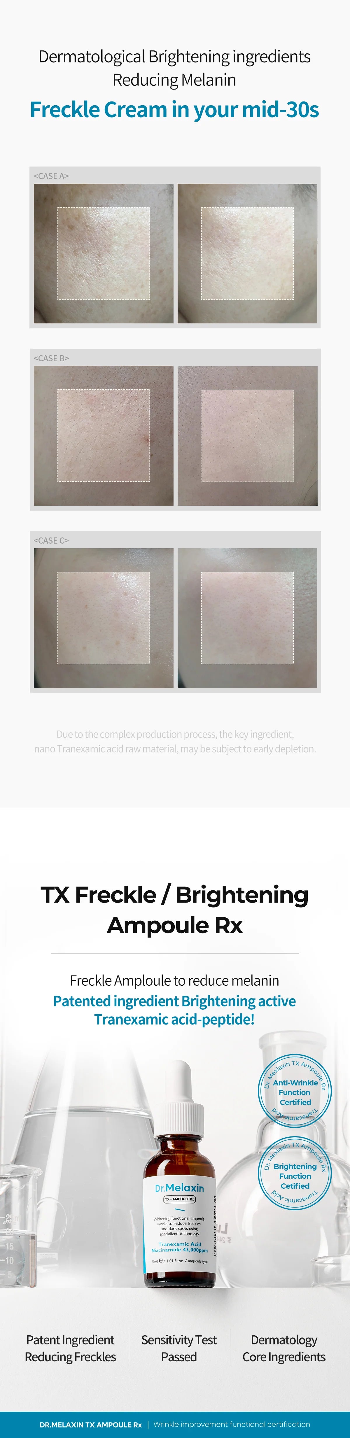 Dr.Melaxin TX Ampoule Rx is a specialized serum designed to address freckles and dark spots, promoting a more even and radiant complexion. Its advanced formulation combines Tranexamic Acid and a high concentration of Niacinamide to effectively target skin discoloration.
